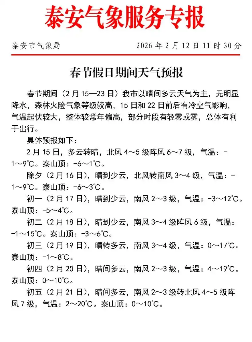 2月22日(正月初六):全市晴转多云。气温最低-6℃~5℃,最高6℃~12℃。